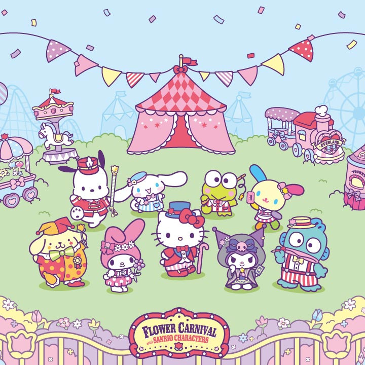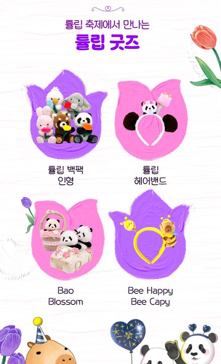 작년에 이어 올해도 산리오 캐릭터들과의 협업이 이어집니다. 헬로키티, 마이멜로디, 쿠로미 등 인기 캐릭터들이 튤립 정원 곳곳에 대형 조형물로 설치되었습니다. 단순히 눈으로 보는 것에 그치지 않고, 특정 시간에는 산리오 캐릭터들이 실물로 등장하는 댄스 타임과 포토 타임이 운영됩니다.