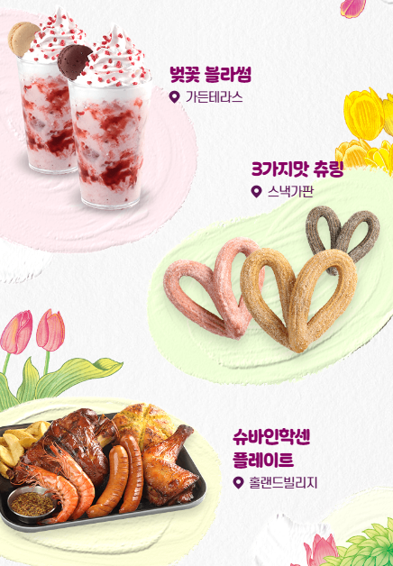 포시즌스 가든 근처의 가든 테라스와 온실 라운지에서는 튤립 모양의 타르트, 봄꽃 샐러드, 딸기 에이드 등 시즌 한정 메뉴를 판매합니다. 또한, 50주년 로고가 새겨진 튤립 헤어밴드와 꽃 인형은 이번 시즌에만 구할 수 있는 한정판이므로 기념품 샵을 들러보시길 권장합니다.